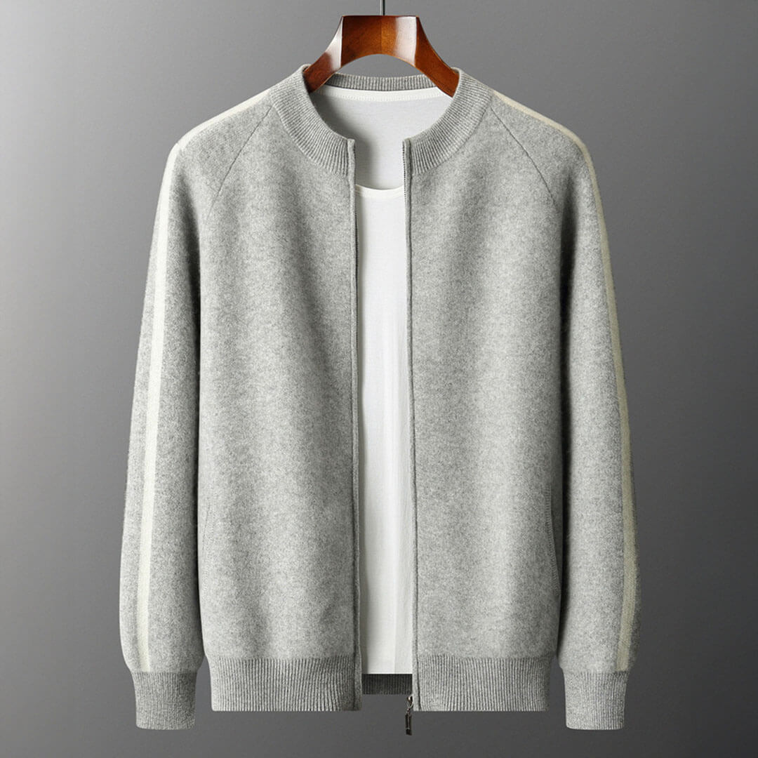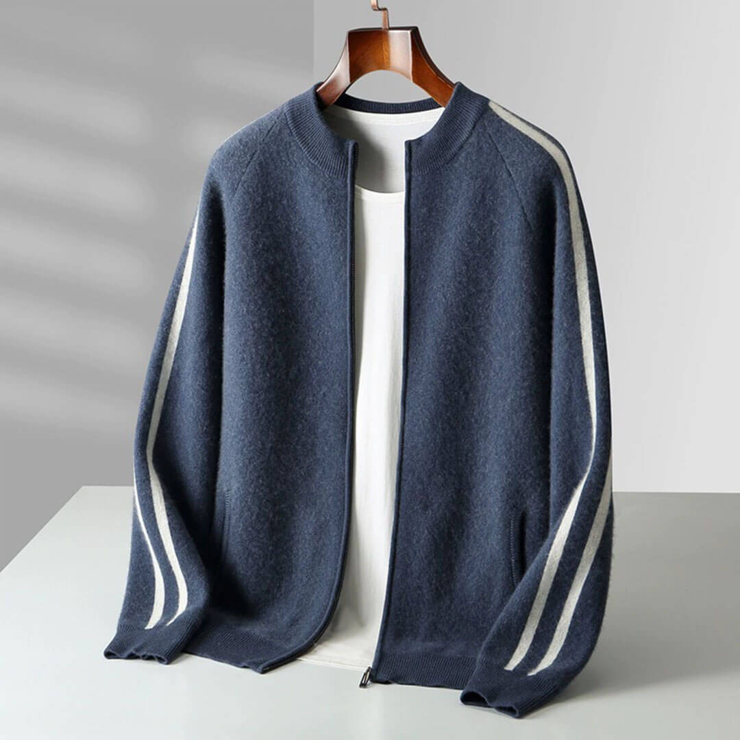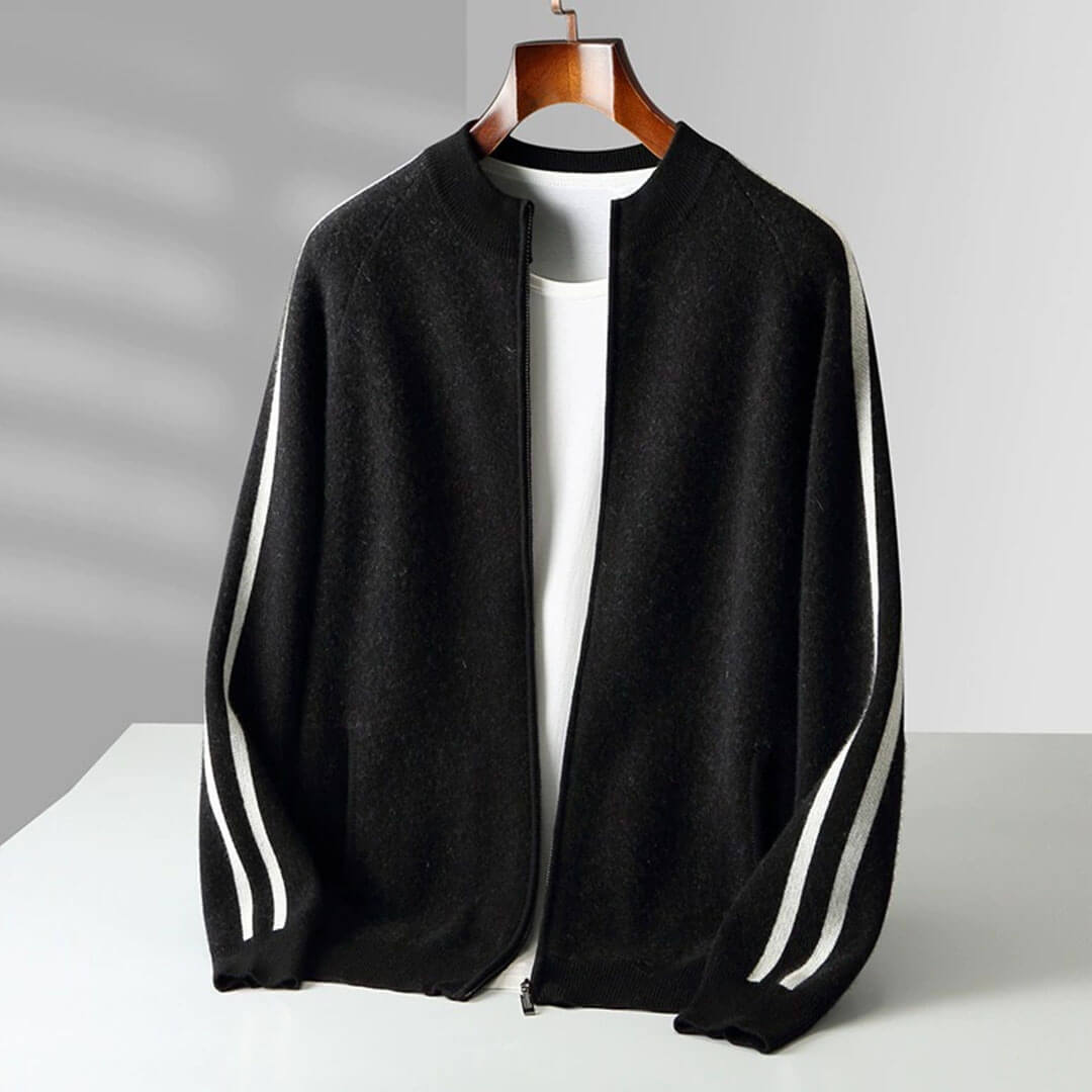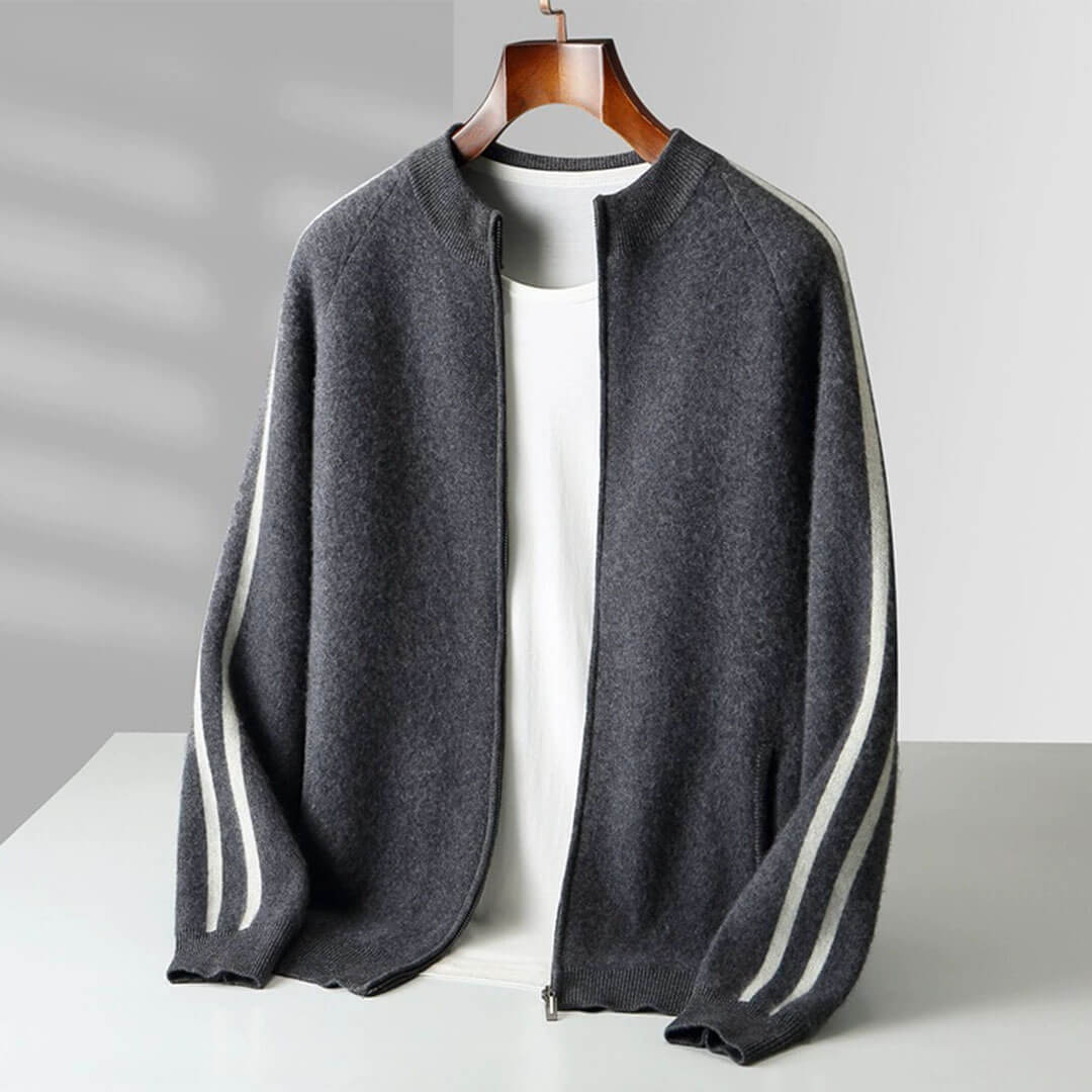 Varenna Cashmere Zip Cardigan offers premium cashmere comfort with a modern zip front, delivering softness, breathability, and lightweight warmth. Striped sleeves add a dynamic accent, while ribbed finishes ensure a clean fit. Tailored for versatility, it transitions effortlessly between casual and refined looks.